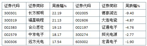 在電子行業(yè)核心企業(yè)內(nèi),長(zhǎng)方照明以22.19%的周漲幅位居第一,德豪潤(rùn)達(dá)下跌9.40%,位列跌幅榜首位: