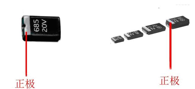 下面這幅圖標示出了鉭電容的正極,理所當然沒有標示的那頭就是鉭電容的負極了。