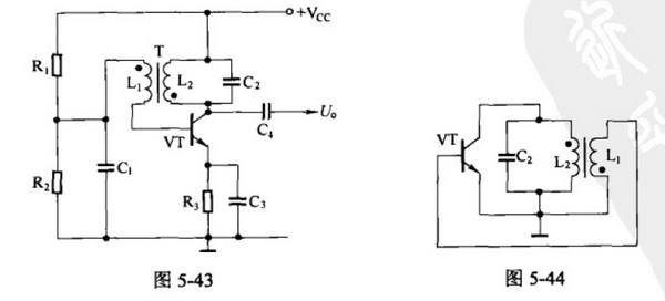 變壓器耦合振蕩器工作原理可用圖5-44說(shuō)明:L2與C2組成的LC并聯(lián)諧振回路作為晶體管VT的集電極負(fù)載,VT的集電極輸出電壓通過(guò)變壓器T的振蕩線(xiàn)圈L2耦合至反饋線(xiàn)圈L1,從而又反饋至VT基極作為輸入電壓。由于晶體管VT的集電極電壓與基極電壓相位相反,所以變壓器T的兩個(gè)線(xiàn)圈L1與L2的同名端接法應(yīng)相反,使變壓器T同時(shí)起到倒相作用,將集電極輸出電壓倒相后反饋給基極,實(shí)現(xiàn)了形成振蕩所必須的正反饋。因?yàn)椴⒙?lián)諧振回路在諧振時(shí)阻抗最大,且為純電路,所以只有諧振頻率fo能夠滿(mǎn)足相位條件而形成振蕩,這就是LC回路的選頻作用。