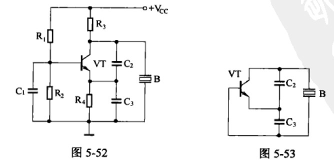 2.從圖5-53所示交流等效電路可見,這是一個電容三點式振蕩器,晶體B在這里等效為一個電感元件使用,與震蕩回路電容C2、C3一起組成并聯諧振回路,共同決定電路的振蕩頻率。