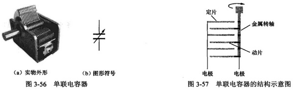 電容器是由多個連接在一起的金屬片作定片,以多個與金屬轉(zhuǎn)軸連接的金屬片作動片構(gòu)成。單聯(lián)電容器的實物和圖形符號如圖3-56所示。