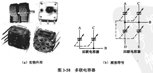 1.外形與圖形符號。多聯(lián)電容器是指將兩個或兩個以上的可變電容器結(jié)合在一起并且可同時調(diào)節(jié)電容器。常見的多聯(lián)電容器有雙聯(lián)電容器和四聯(lián)電容器,多聯(lián)電容器的實物外形圖形如圖3-58所示。