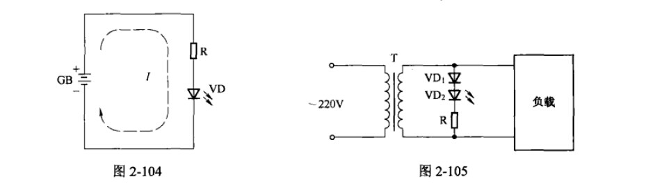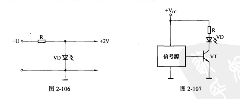 1、發(fā)光二極管用作指示電路。發(fā)光二極管的典型應(yīng)用電路如圖2-104所示,R為限流電阻,I為通過(guò)發(fā)光二極管的正向電流。發(fā)光二極管的管壓降一般比普通二極管大,約為2V,電源電壓必須大于管壓降,發(fā)光二極管才能正常工作。