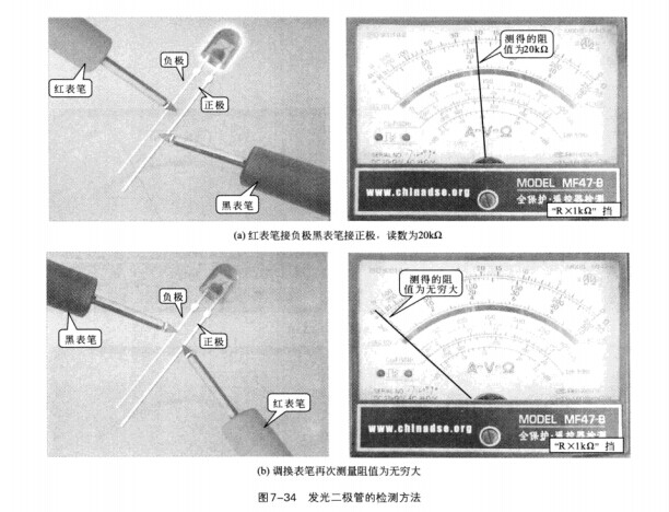 發(fā)光二極管的檢測(cè)操作見(jiàn)圖7-34。