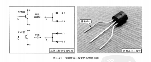 晶體三極管可以分為NPN型和PNP型兩種。在實際電路中,檢測判別待測的晶體三極管的類型時,可以將晶體三極管內等效有兩個二極管,二極管具有單向導電性,用萬用表測量正向阻抗很低,而反向阻抗為無窮大。待測的晶體三極管,假設左邊的引腳為基極,根據集電極(c)與發射極(e)兩極間的正反向阻抗都很大的特點,通常大于幾百千歐,根據這個簡單的等效電路可判別出基極(b)。